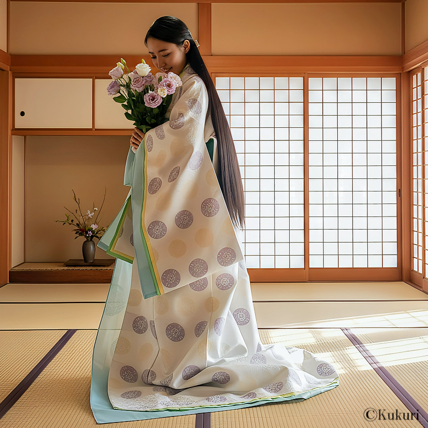 最近は春や秋でも暑い日が多いので、袿の下に「単衣」として着るのもおすすめ!透けた風合いが儚げで、優雅です。