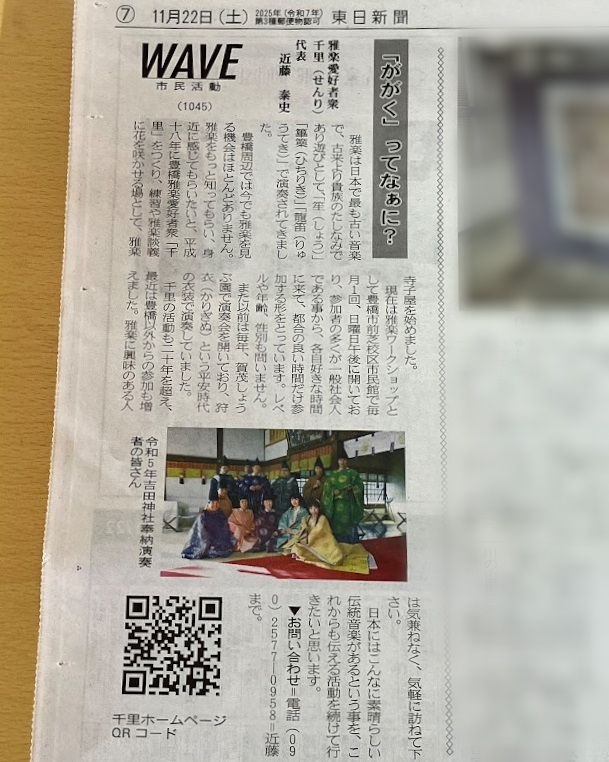 令和7年(2025年)11月20日発行の東日新聞「市民活動WAVE」で、伝統芸能「雅楽」を今に伝える菊理の活動「雅楽ワークショップ」が紹介されました。