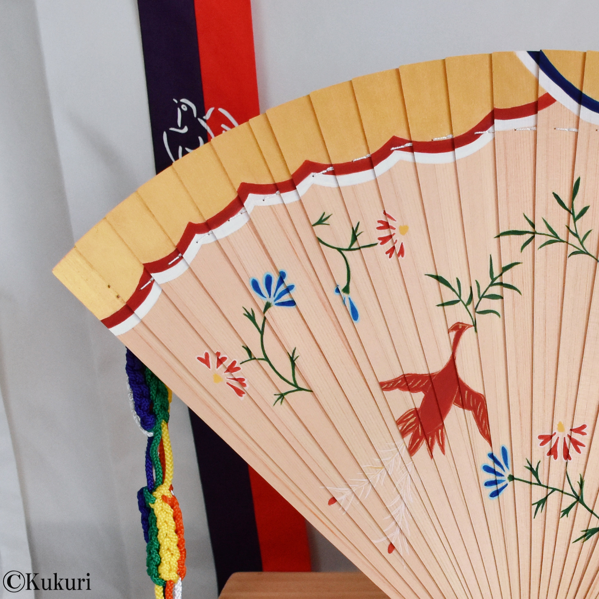 そもそも桧扇とは、複数のヒノキの薄板を糸で綴じた扇で、千年以上前の平安時代に誕生した日本発祥の扇子です。現代では神社において巫女さんが「浦安の舞」などの祭祀舞、神楽舞などを舞う時に使ったりしています。