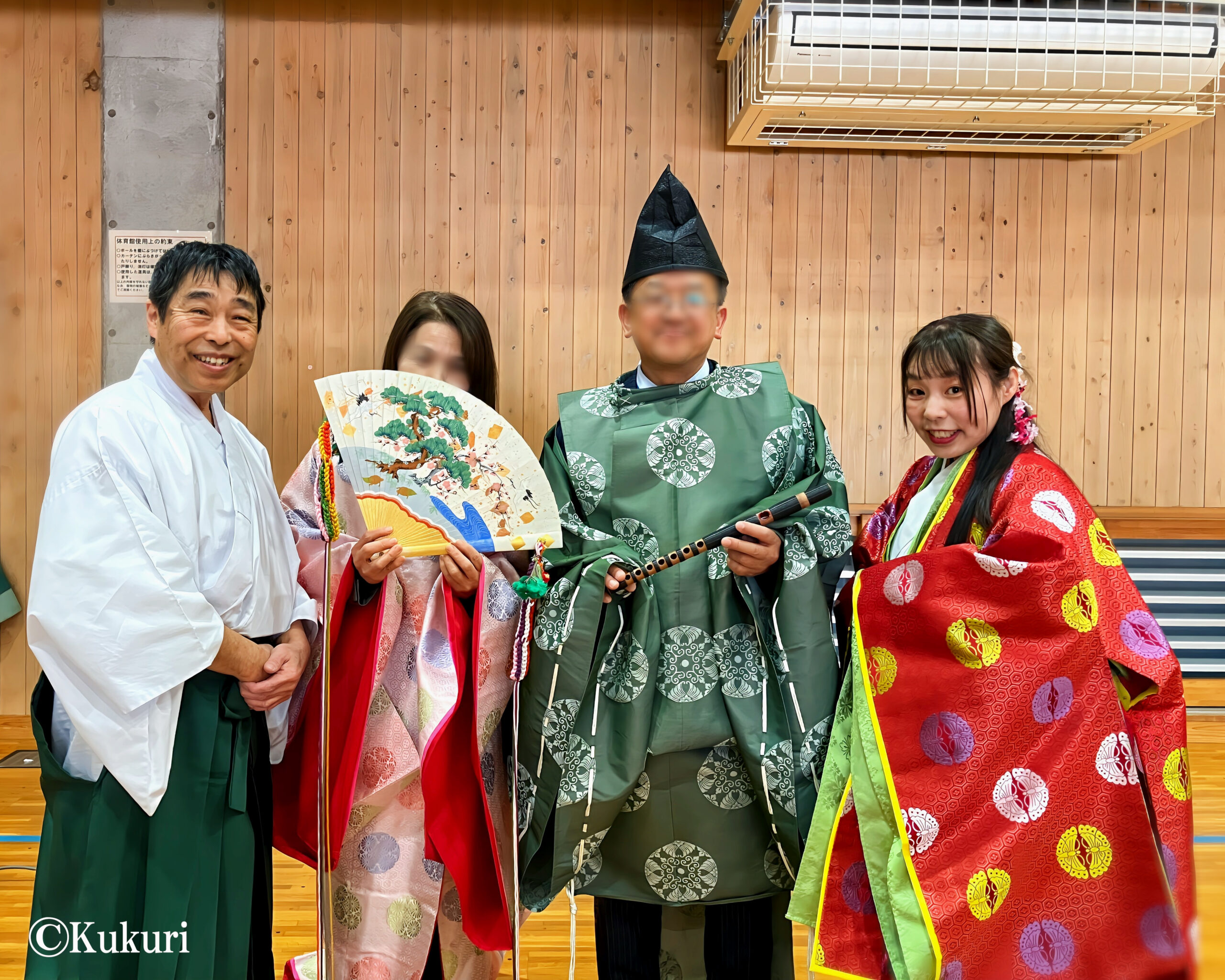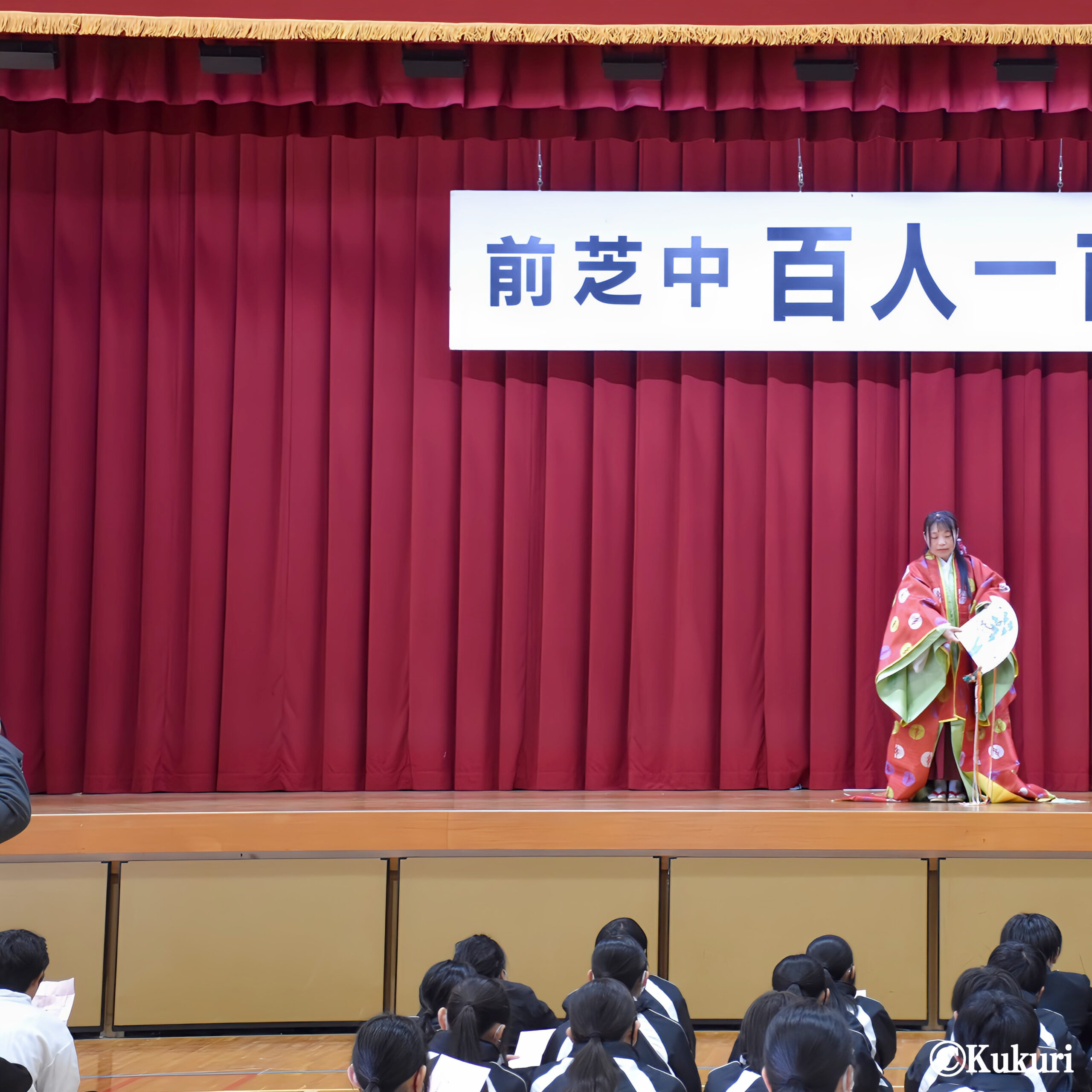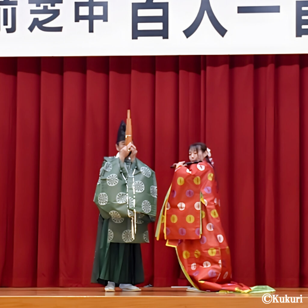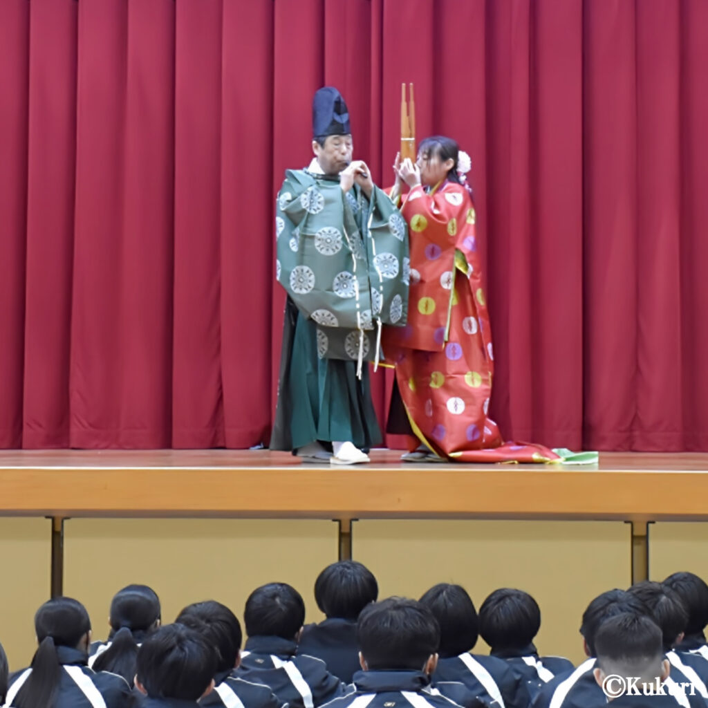 「豊橋市立前芝中学校」様よりご依頼をいただき、令和8年1月8日、伝統行事「百人一首大会」のオープニングセレモニーとして、菊理の雅楽演奏と舞をお楽しみいただきました。当日は、1年生から3年生まで全学年が集まる体育館にての公演となりました。